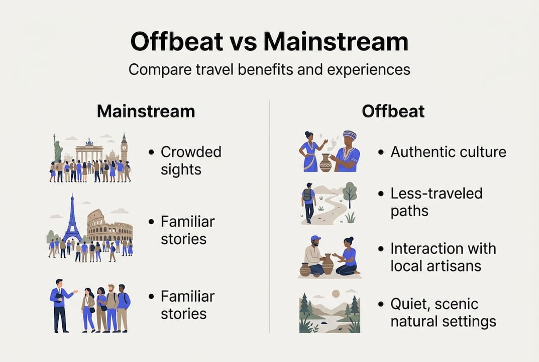 The core difference between offbeat and mainstream destinations comes down to three things: authenticity, crowd levels, and cultural depth. Mainstream spots are often optimized for tourism, which means you get curated versions of local life. Offbeat destinations give you the unfiltered version. You eat where locals eat, you walk streets that were not designed for photo ops, and you leave with a real sense of a place.
